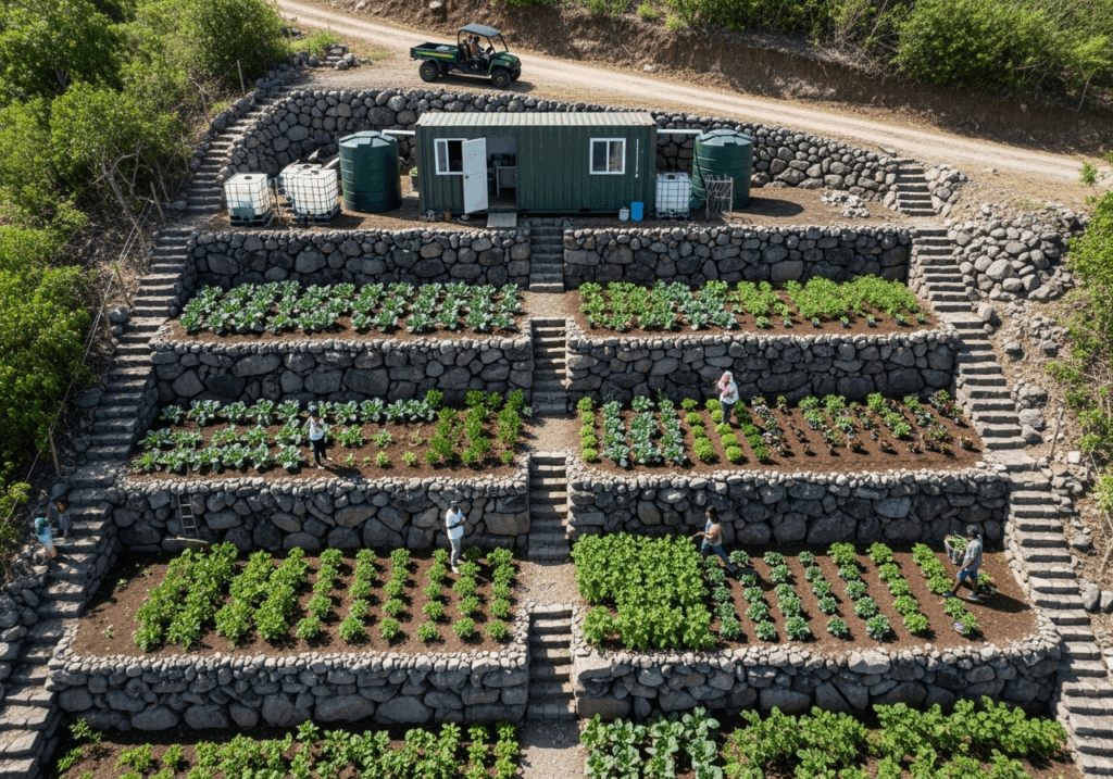 Our approach begins with terraced heritage gardens at Plantation Succour, where CSA crops grow alongside Community Gardens plots in a landscape shaped by centuries of Caribbean agricultural wisdom. The same stone walls built by enslaved ancestors now support a thriving food system that prioritizes community ownership over corporate profit.